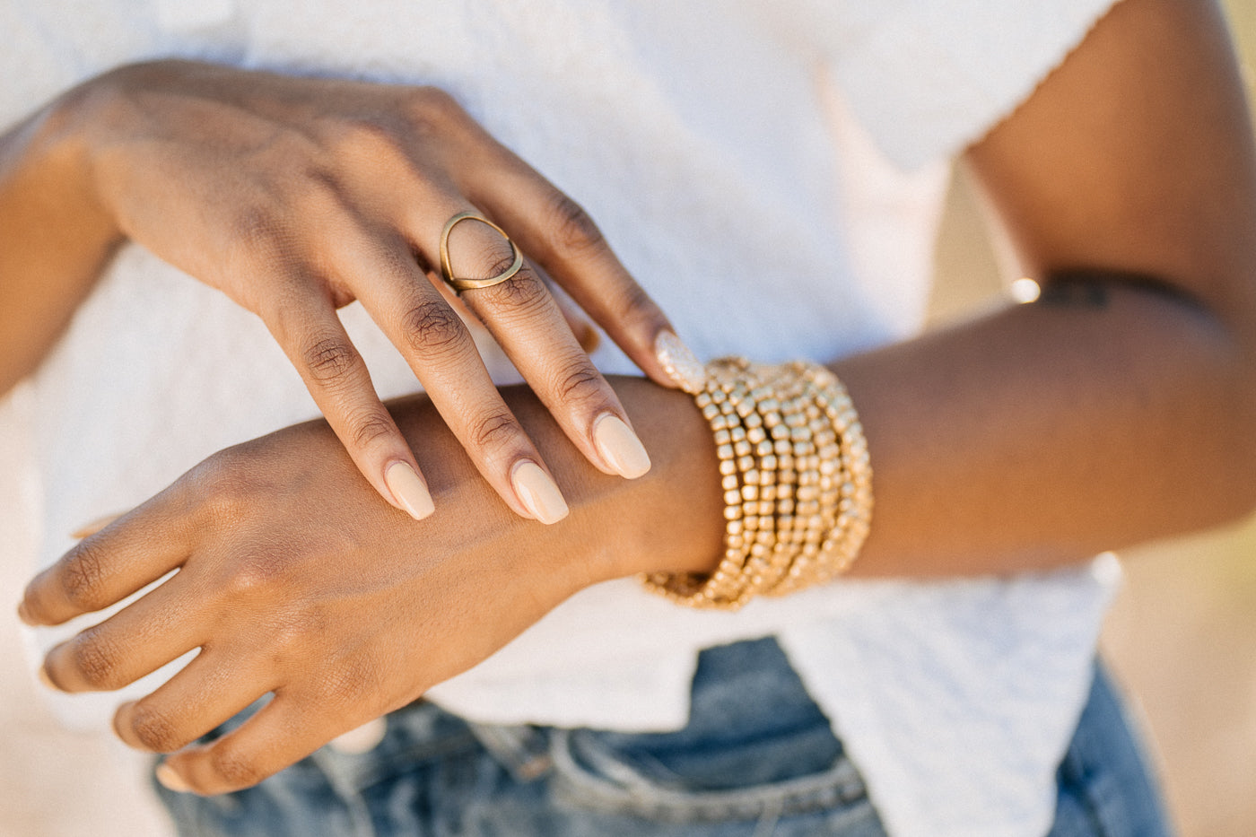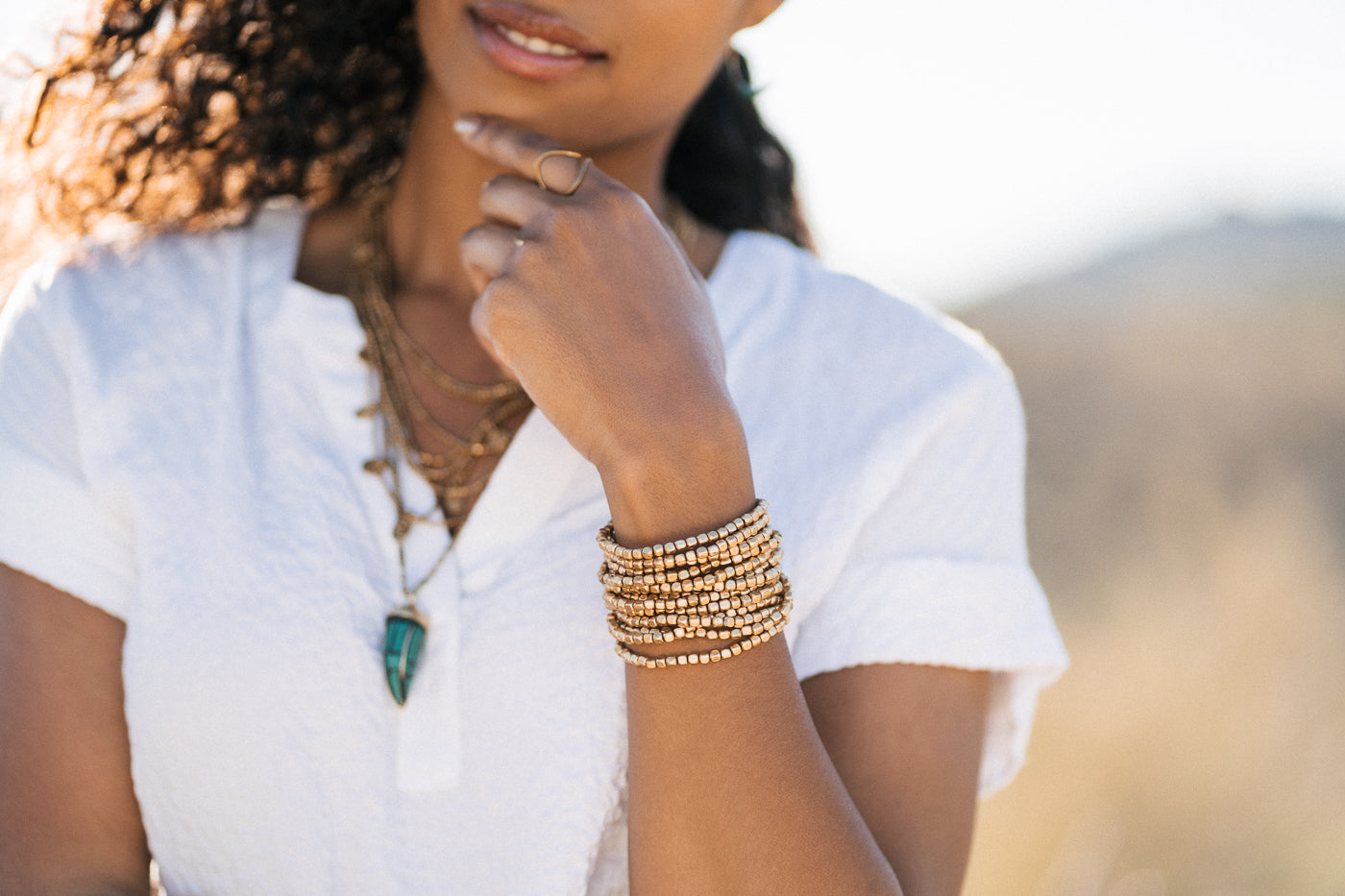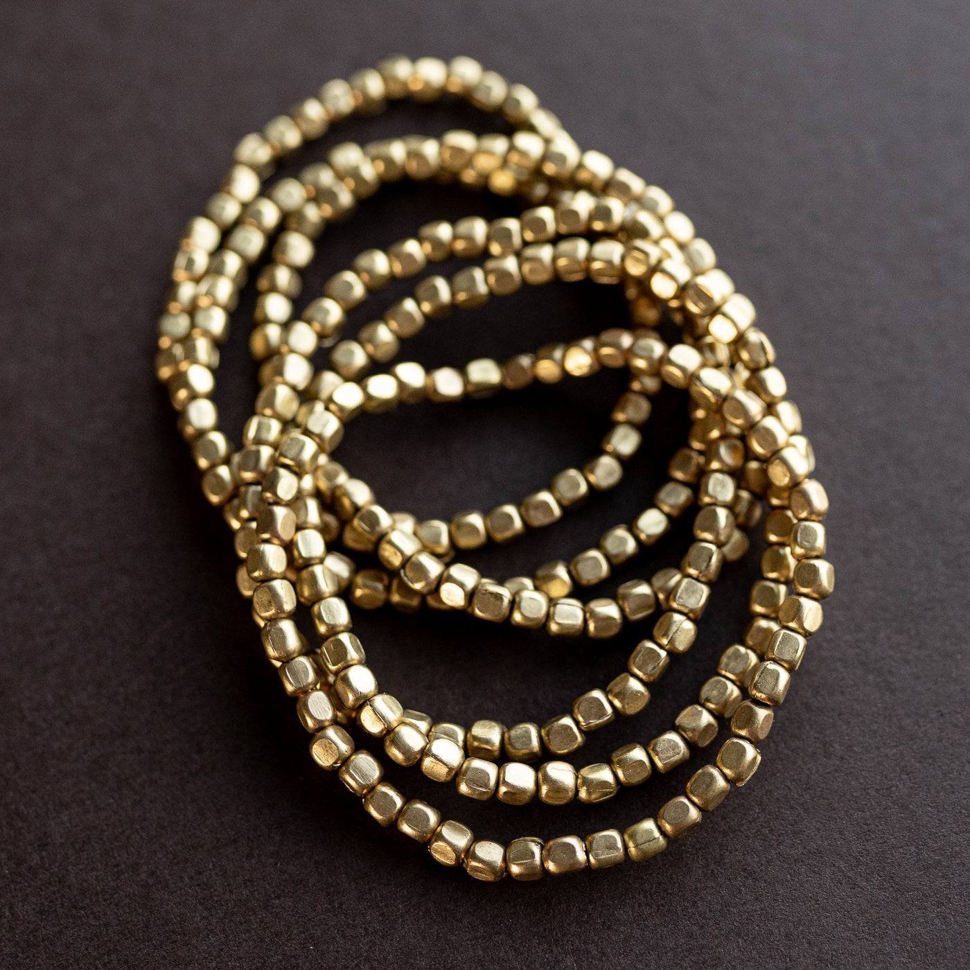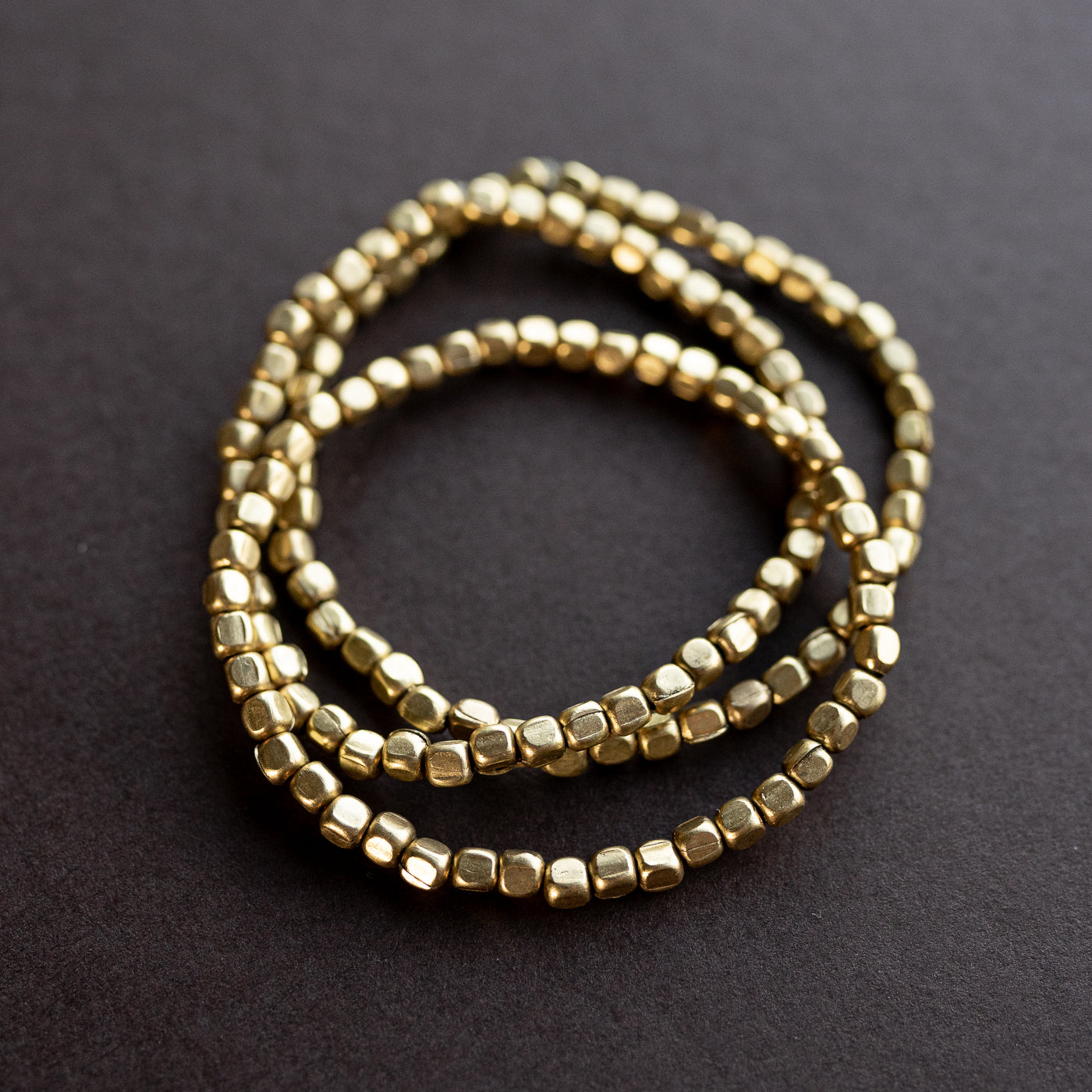 Brass rounded cube stretch bracelets - small to medium wrist -model is wearing 12 bracelets.