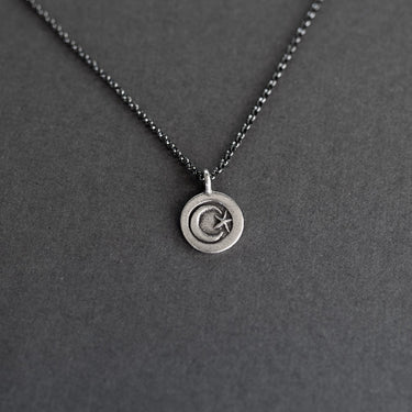 Hill Tribe fine silver round pendant with a moon and star, on oxidized sterling silver chain. 16"- 18" adjustable
