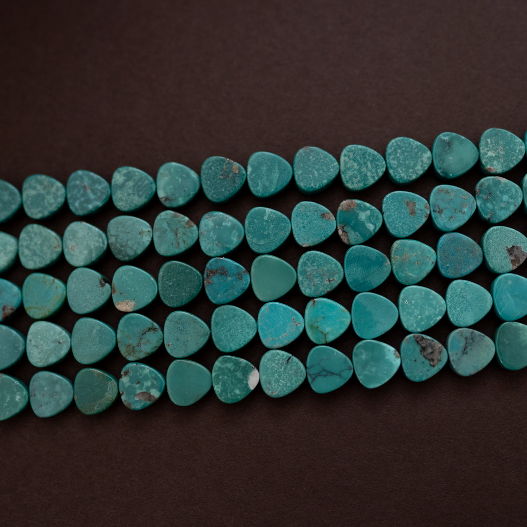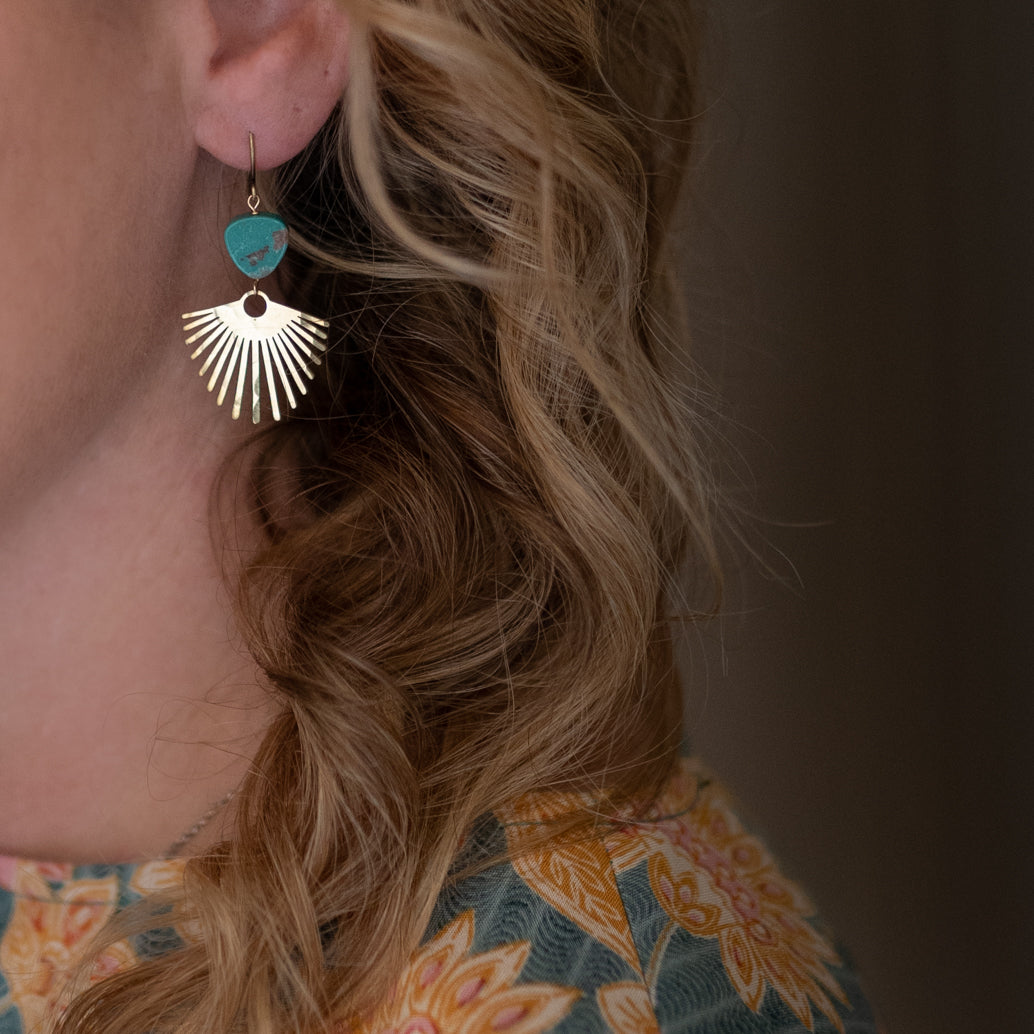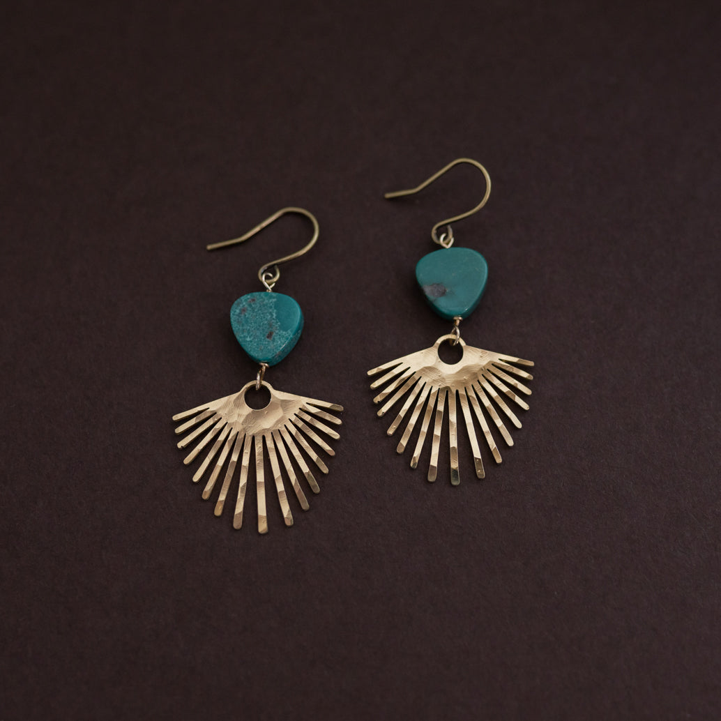 Turquoise tear drops and hand hammered brass palms. Just under 2” including the hook. Each pair is one of a kind.