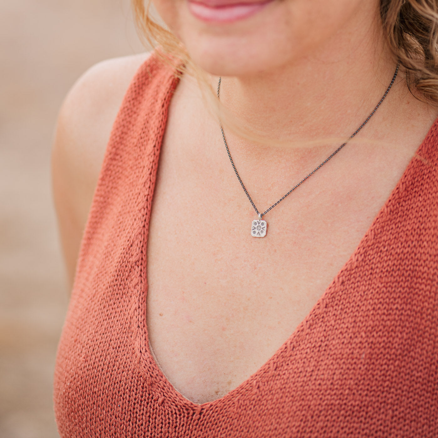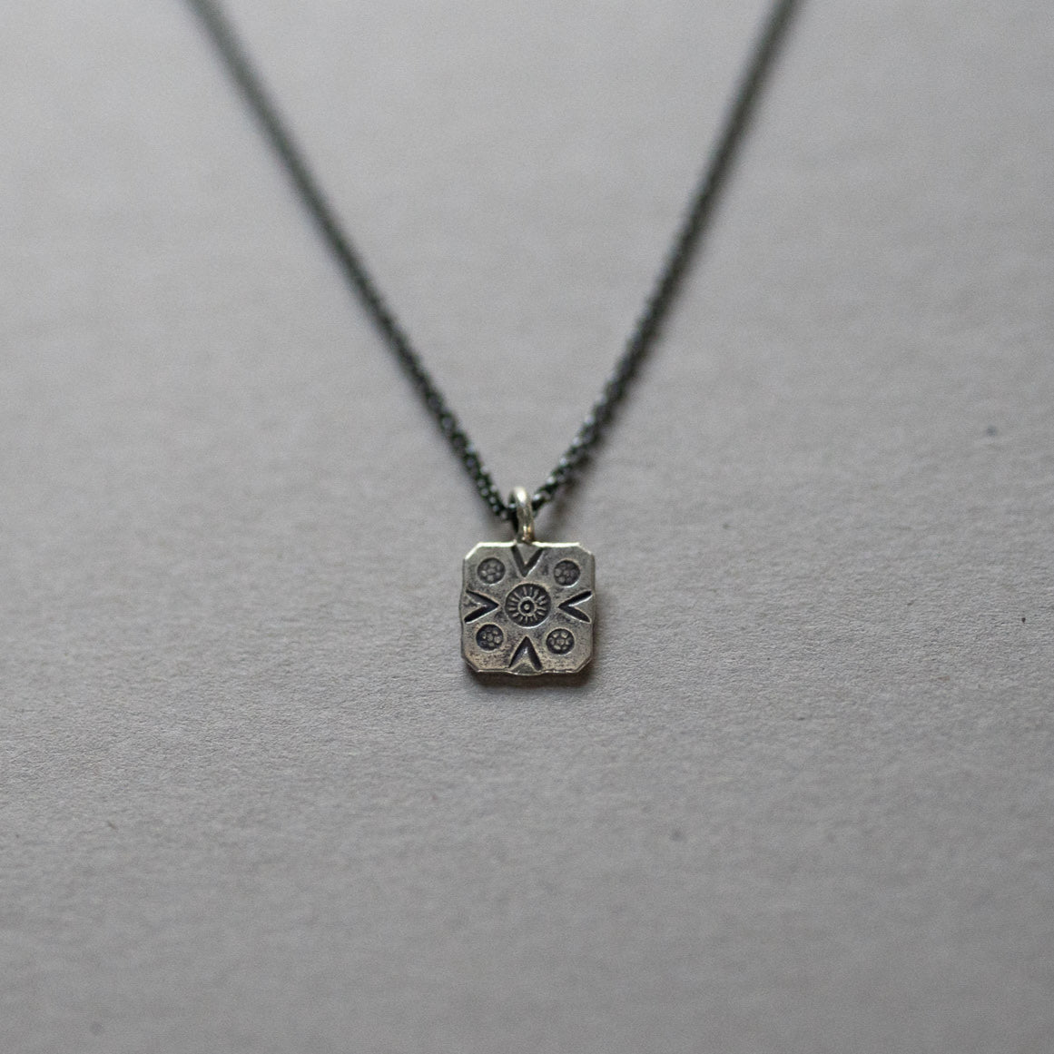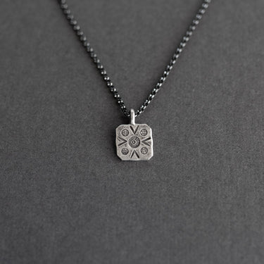 Hill Tribe fine silver square pendant with little arrows and dots, on oxidized sterling silver chain. 16"- 18" adjustable