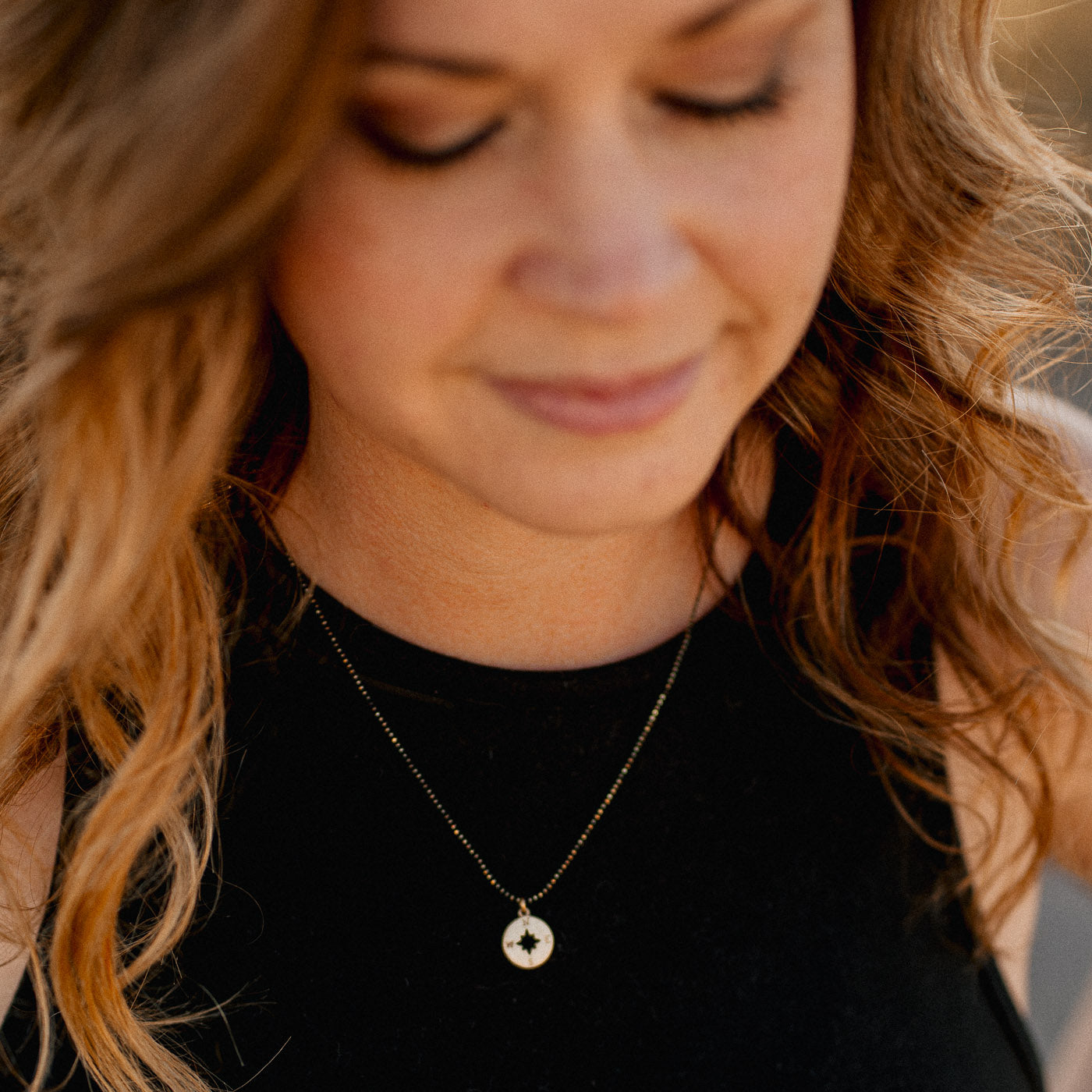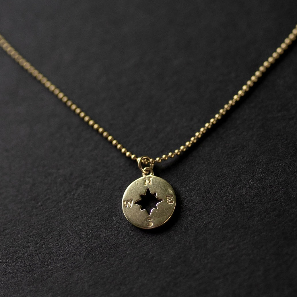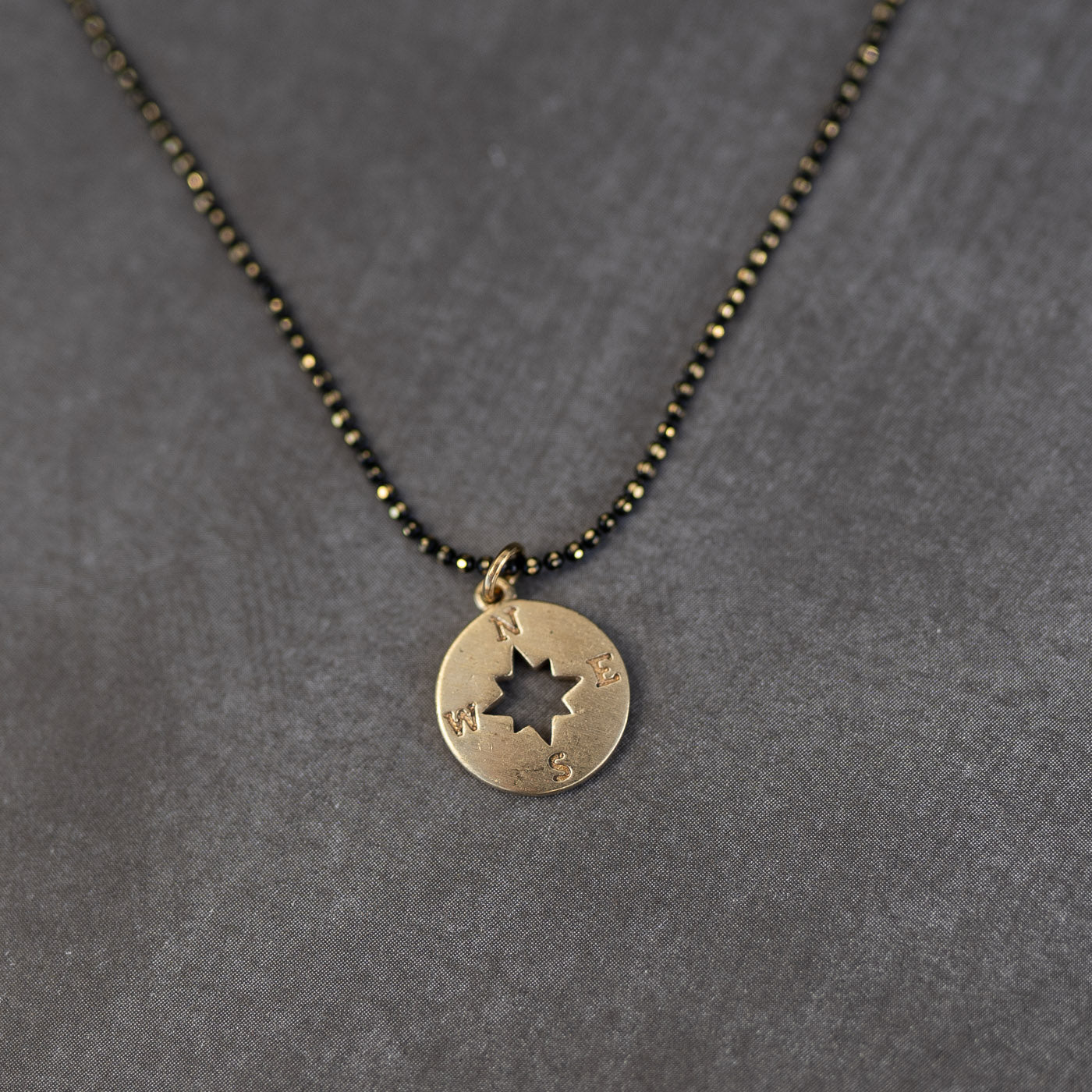 Trust your compass. Choose between black or gold brass ball chain, with a brass compass pendant. Choose your necklace length. Model is wearing an 18" chain