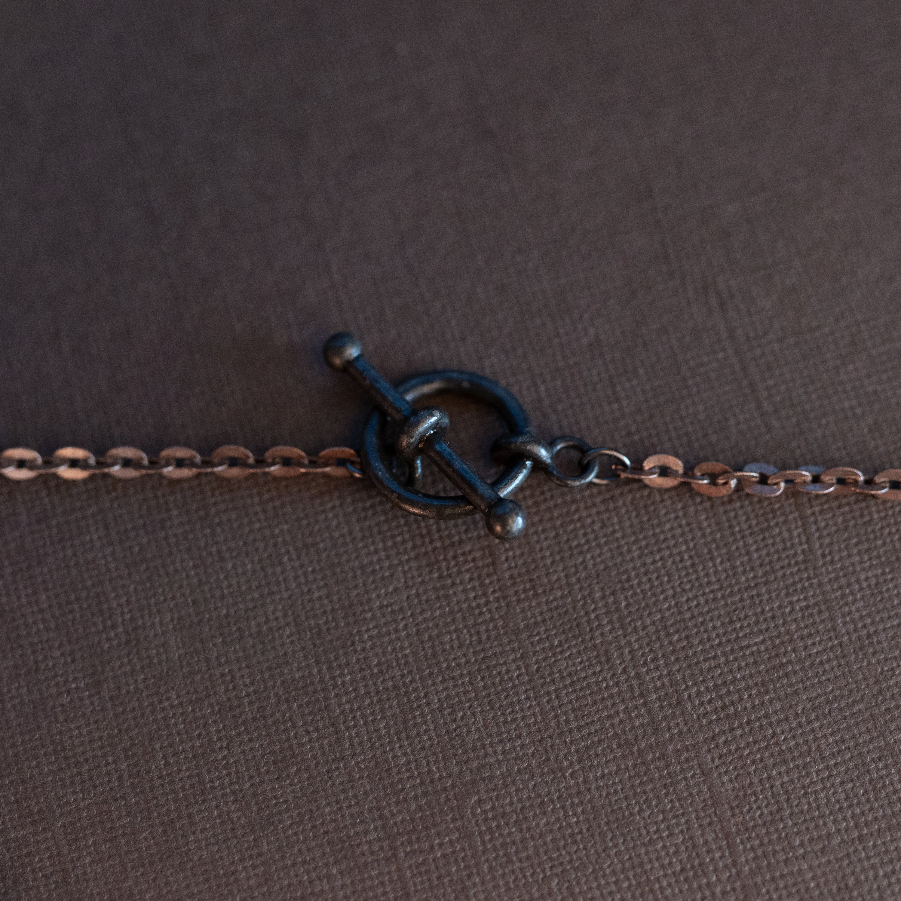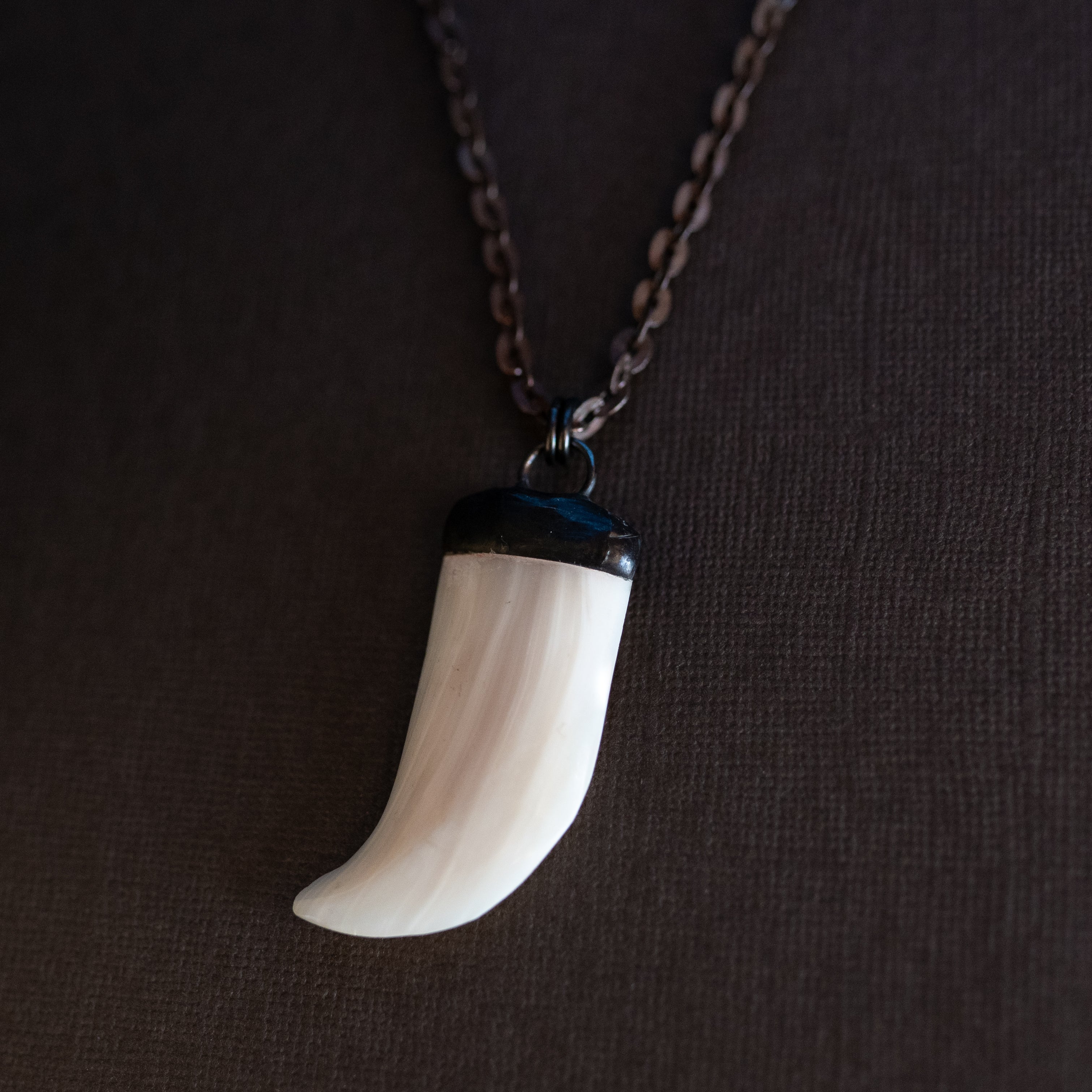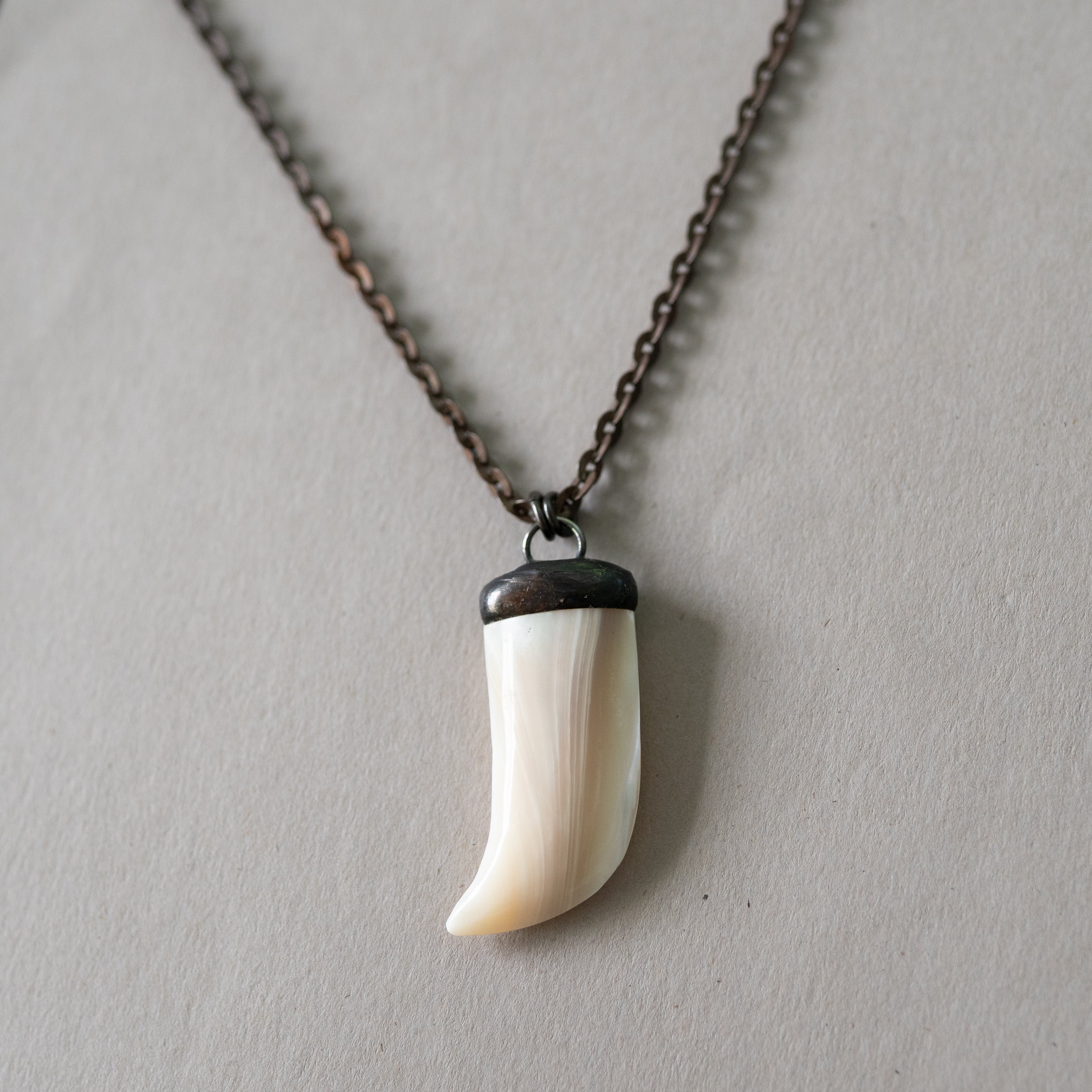 Vintage dark copper chain, a hand-soldered mother of pearl claw shaped pendant from the 70s and a gunmetal toggle clasp. 20" in length.