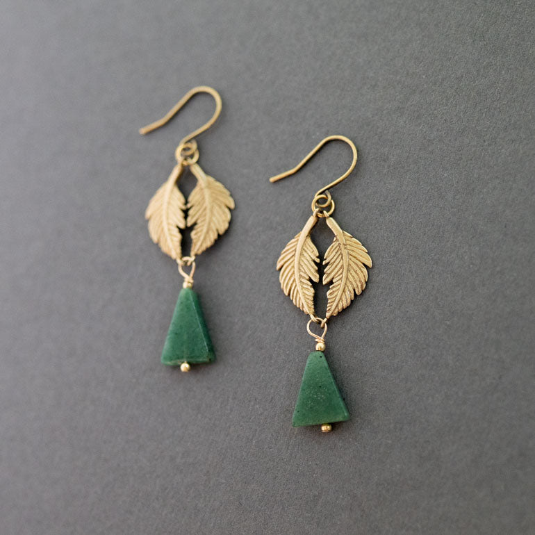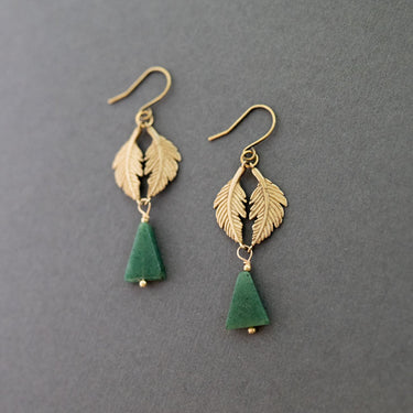 Made with brass and green aventurine in slightly varying sizes as this is a natural stone. Measurements: Barely over 2" including the hook or just over 1.5" from the bottom of the hook.