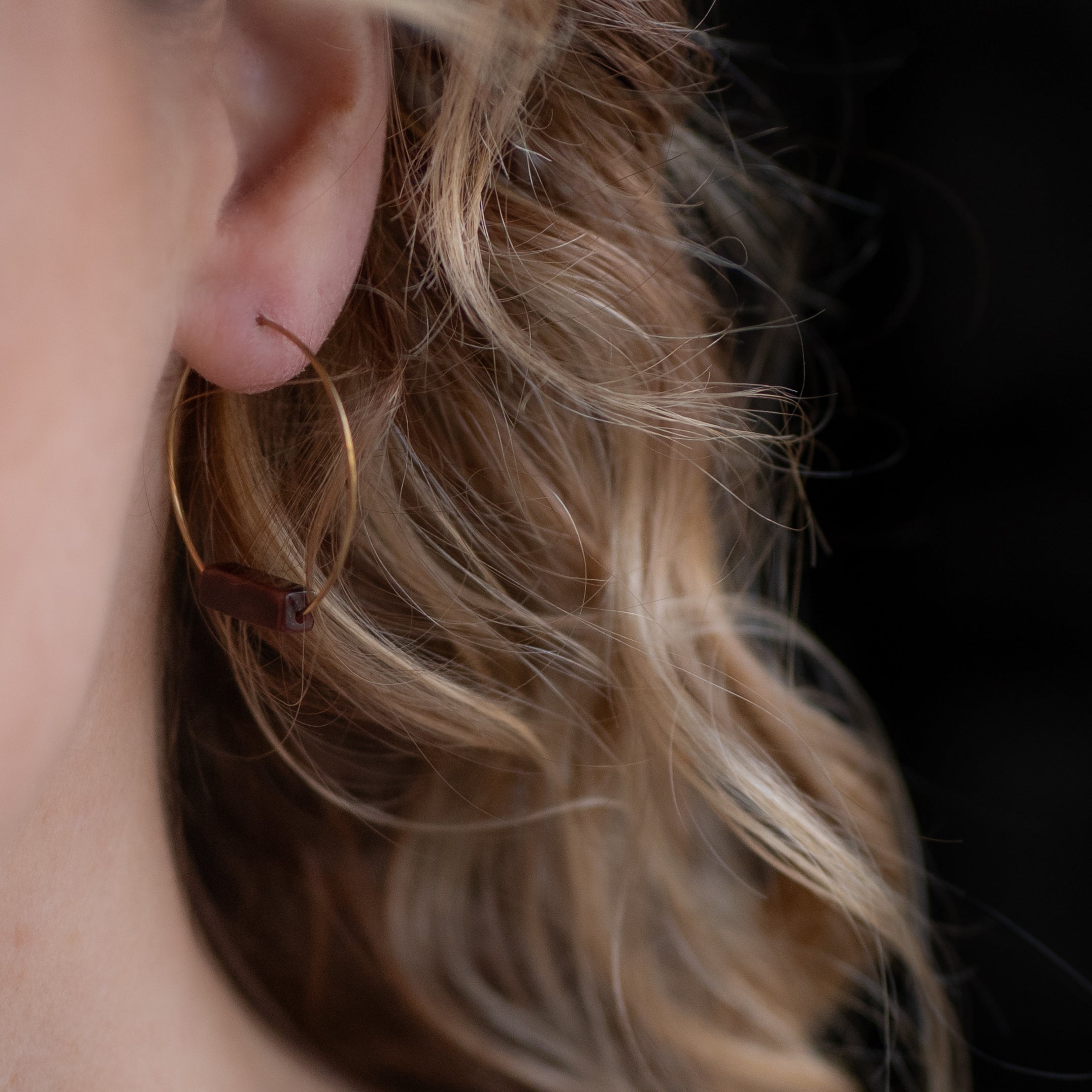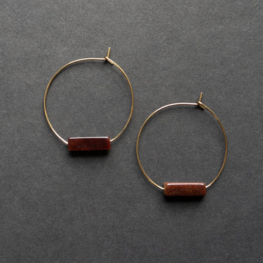 Red tiger eye tubes on 30mm brass bar hoops. Named after Red Rock Canyon for the color of the iron-rich rock formations there.