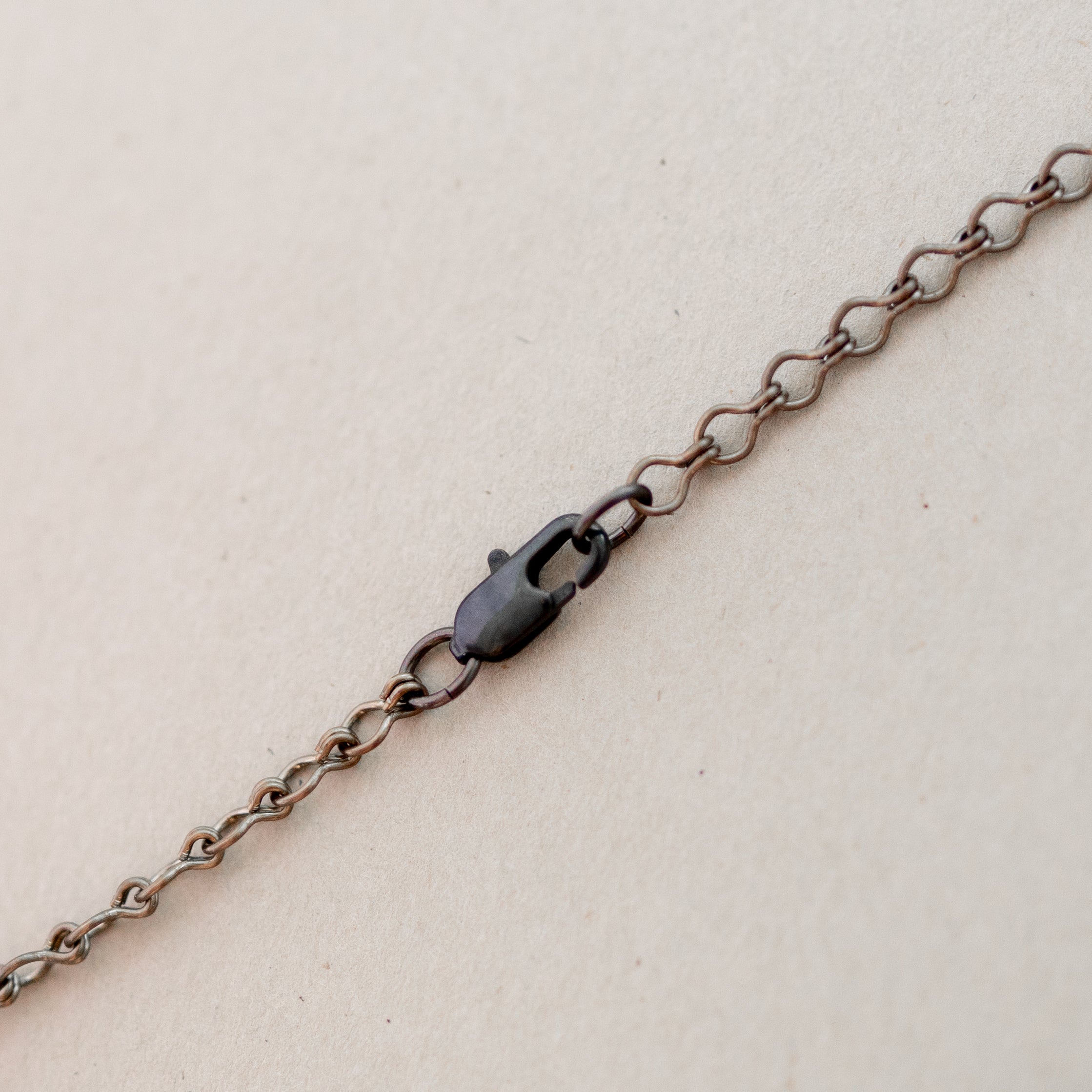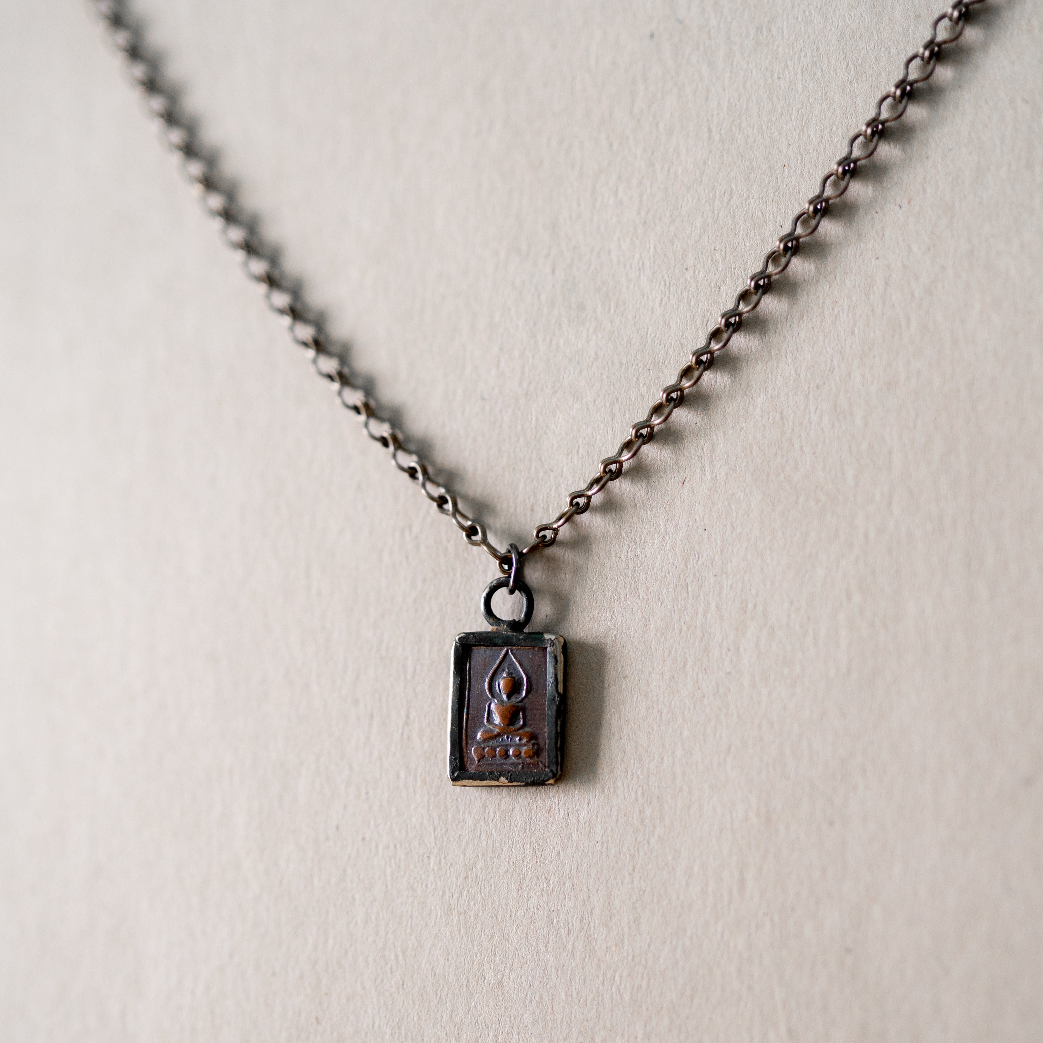 Small soldered copper pendant, on antique brass chain finished with a gunmetal lobster clasp. 18”